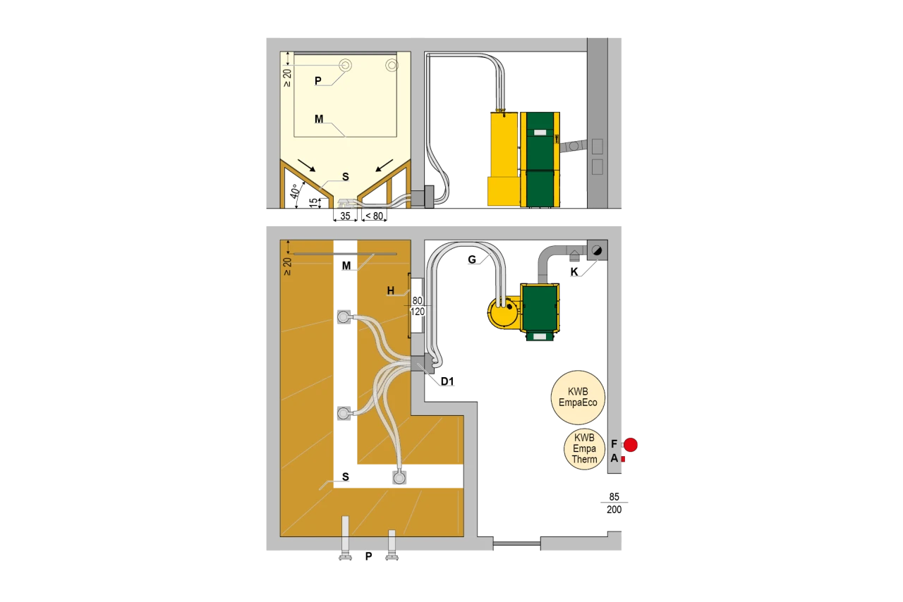 Der Pelletlagerraum kann neben, über oder unter dem Heizraum platziert werden, je nach räumlichen Gegebenheiten.