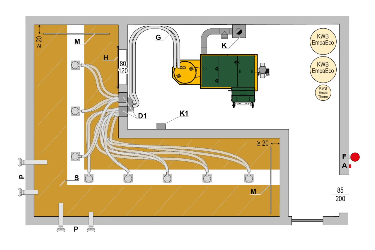 Entfernungen von bis zu 25 Metern und Höhenunterschiede von bis zu 5 Metern zwischen Heizraum und Pelletlager werden mühelos überwunden. Die KWB Saugförderung sorgt damit für eine zuverlässige und komfortable Brennstoffversorgung, selbst bei anspruchsvollen baulichen Gegebenheiten.