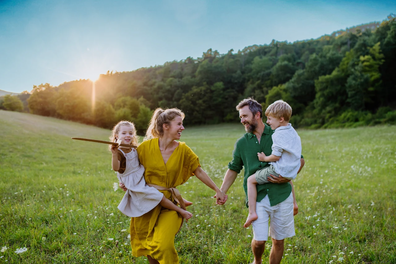 Familie sitzt lachend auf der Terrasse vor dem Haus und genießt die Sonne.